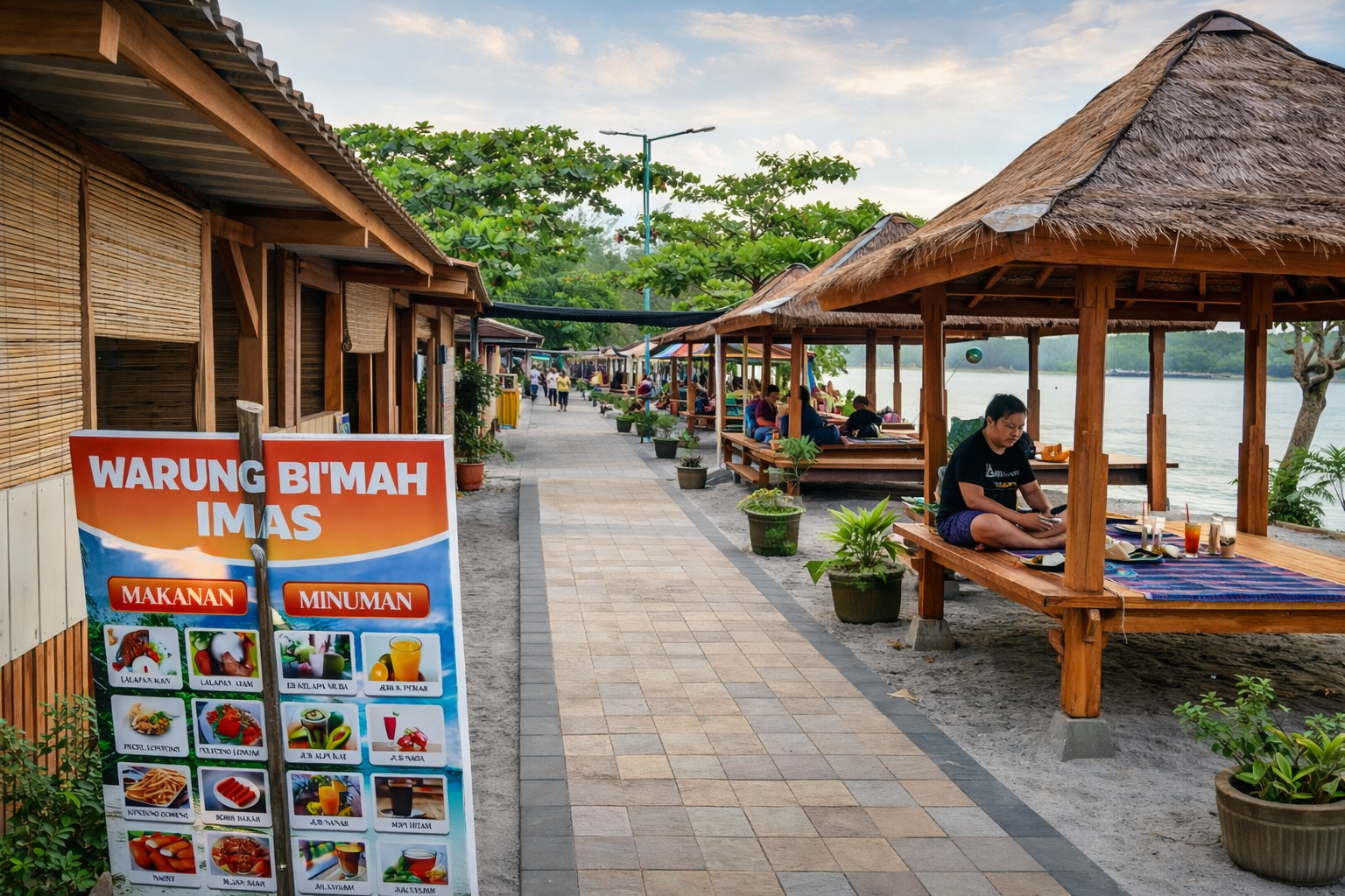 Wisatawan dapat menikmati makanan dan minuman khas lokal di tempat yang nyaman, dengan pemandangan laut yang langsung terbentang di depan mata. Jalur pejalan kaki yang mulai dirapikan juga menambah kesan tertib dan bersih.