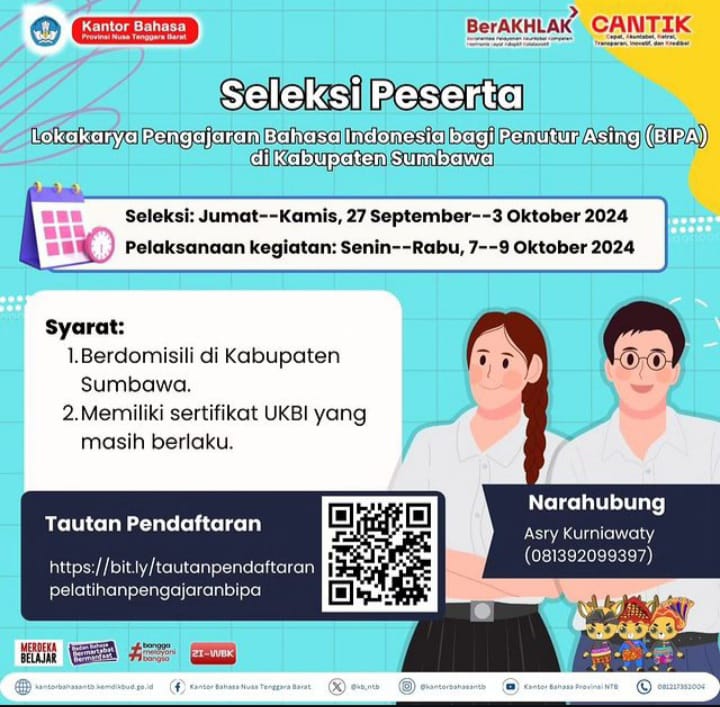 Tanjungtv.com – Kantor Bahasa Provinsi Nusa Tenggara Barat kembali menggelar seleksi peserta untuk lokakarya pengajaran Bahasa Indonesia bagi Penutur Asing (BIPA) di Kabupaten Sumbawa. Kegiatan yang akan berlangsung pada Senin hingga Rabu, tanggal 7 hingga 9 Oktober 2024, ini merupakan upaya dari Kantor Bahasa NTB untuk meningkatkan kompetensi pengajar Bahasa Indonesia dalam konteks internasional, khususnya bagi penutur asing.